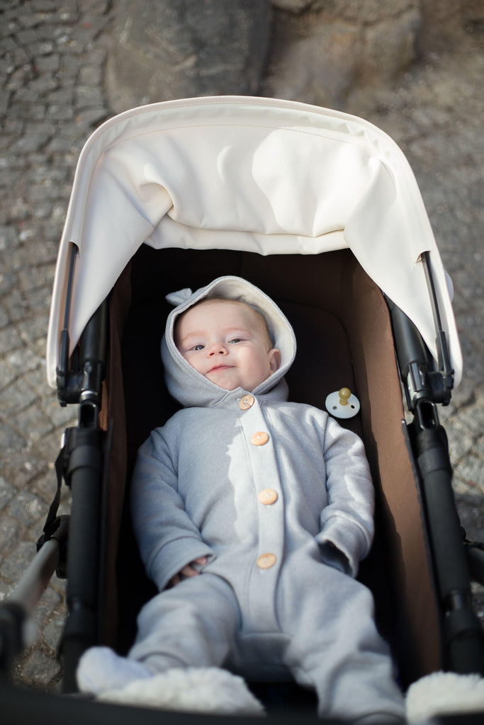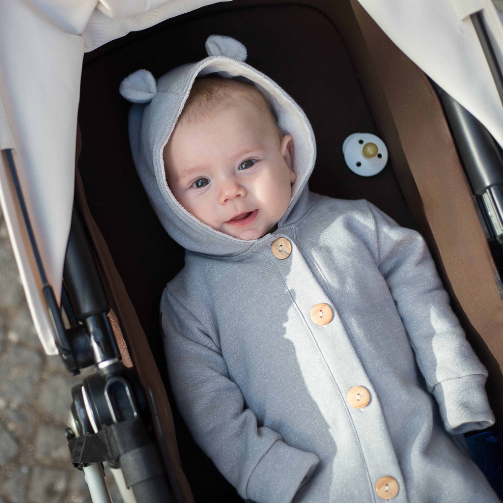 Roztomilý a pohodlný overal v šedé barvě, ideální pro chladné podzimní dny. Měkký materiál zahřeje, ouška na kapuci dodají kouzelný vzhled a praktické zapínání na knoflíky z olivového dřeva zajistí snadné oblékání. Perfektní volba pro vaše malé dobrodruhy. 🍂